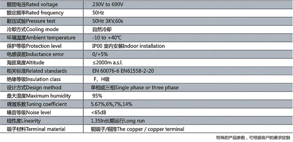 低乐干式铁芯三相或单相电抗器,具有高线性度、高抗谐波能办、低损耗的特点、真空漫漆工艺,保证了产品绝缘性能好,耐高压,低噪音和长寿命。气隙数量和位置的正确选择,保证了产品最低的磁芯和线圈损耗,铁芯柱、扼、气紧固以减少噪音。电抗器装有温度保护装置(常闭125°C),以避免过热。电抗器一般设计成自然风冷。