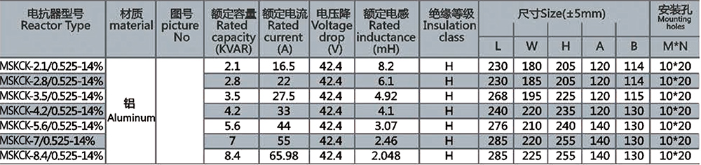 525V 50Hz级调谐电抗器选型表